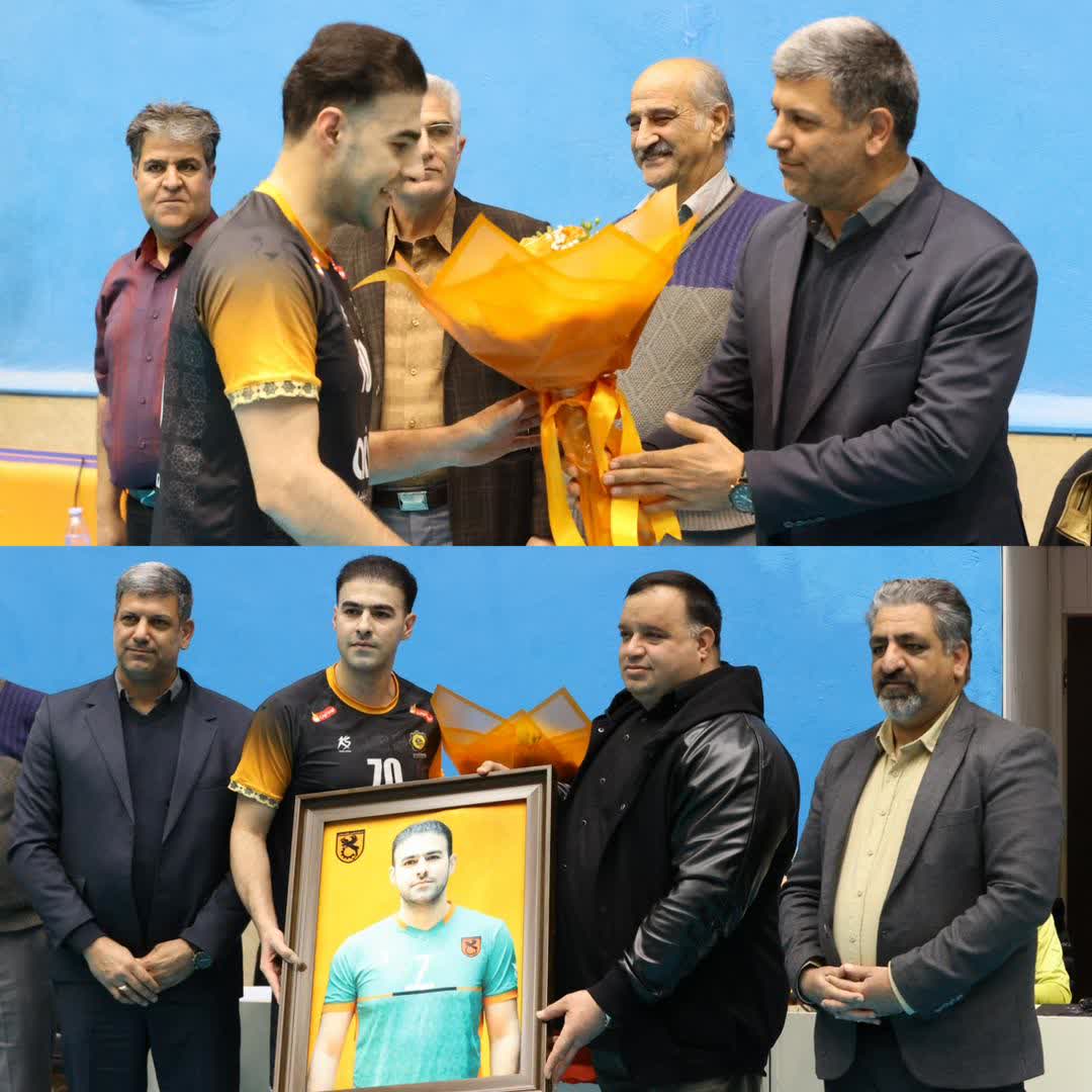 تجلیل باشگاه مس رفسنجان از احد حسنزاده، والیبالیست رفسنجانی تیم شهداب یزد در حاشیه دیدار تیمهای والیبال صنعت مس رفسنجان و شهداب یزد